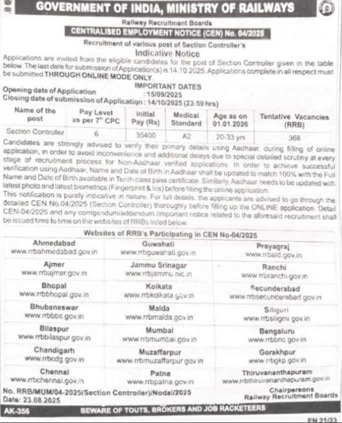 The Railway Recruitment Board (RRB) has released a short notification for the recruitment of 368 Section Controller posts. The online application process will begin on 15 September 2025 and the last date to submit the form is 14 October 2025. Interested and eligible candidates can apply online through the official website rrbahmedabad.gov.in.